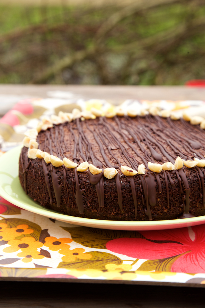 7. Leave the cake to cool for 15 minutes before removing from the tin – then decorate with an optional drizzle of melted chocolate and some chopped hazelnuts.